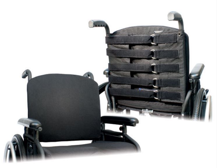 This high density foam back rest with Comfort-Tek cover provides optimal pressure redistribution for enhanced patient comfort and positioning. Five adjustable Velcro straps attach to the frame of the wheelchair to provide additional lumbar support.