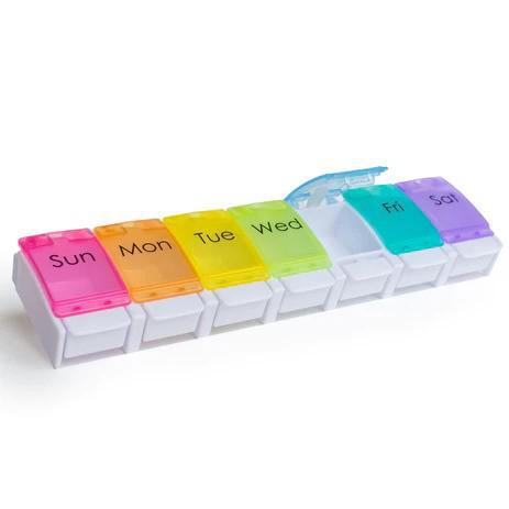 Designed with convenience and efficiency in mind, this pill organizer is meticulously crafted to meet the diverse needs of individuals managing multiple medications. It's easy to use push button design is ideal for those with arthritis and/or limited mobility. Available in daily and twice-daily options, it provides ample space to store your pills, vitamins, and supplements for an entire week. The clear, easy-to-read labels make it simple to identify each day's dosage at a glance, ensuring you never miss a dose.